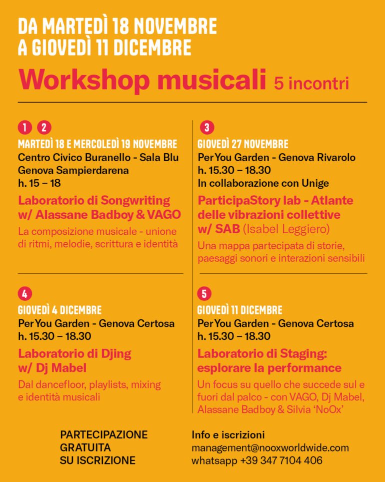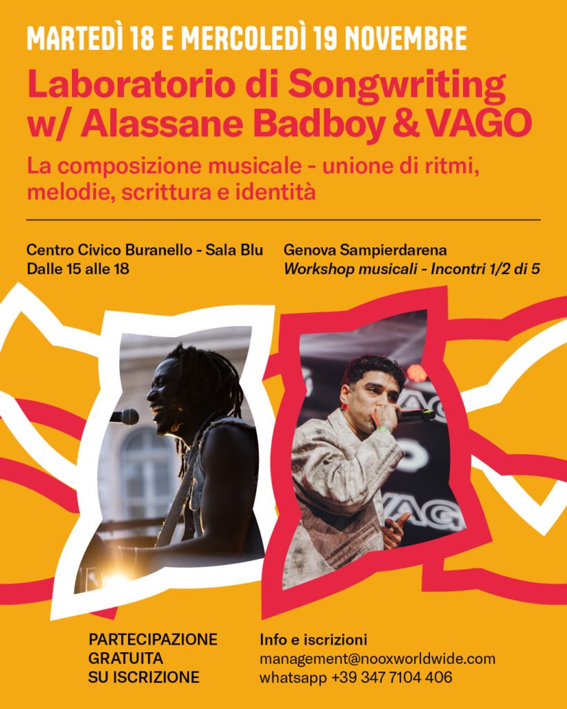 - Laboratorio di Songwriting con Alassane & VAGO (18-19 novembre 2025, Centro Civico Buranello – Sala Blu): un’esplorazione della composizione musicale, unendo ritmi, melodie, scrittura e identità, guidati da due artisti di spicco del panorama musicale italiano e internazionale.