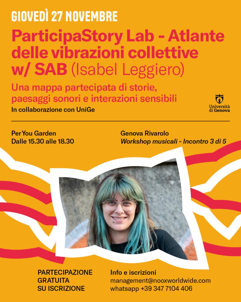 - ParticipaStory Lab – Atlante delle vibrazioni collettive w/ SAB (Isabel Leggiero) (27 novembre 2025, Per You Garden): un’esperienza sensoriale per creare una mappa partecipata di storie, paesaggi sonori e interazioni, in collaborazione con UniGe (Università di Genova – dipartimento Design).
