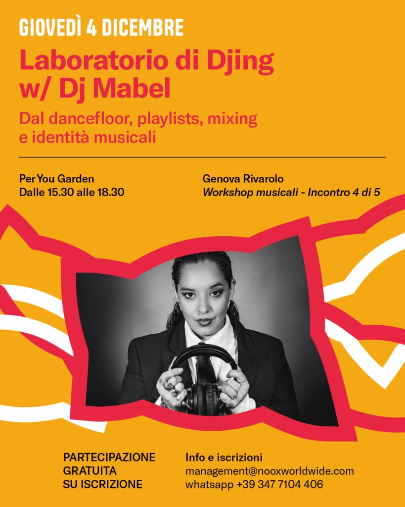- Laboratorio di Djing con Mabel (4 dicembre 2025, Per You Garden): un viaggio nel mondo del DJing, esplorando il dancefloor, le playlist, il mixing e le identità musicali con DJ Mabel, artista ecuadoriana-italiana in rapida ascesa.