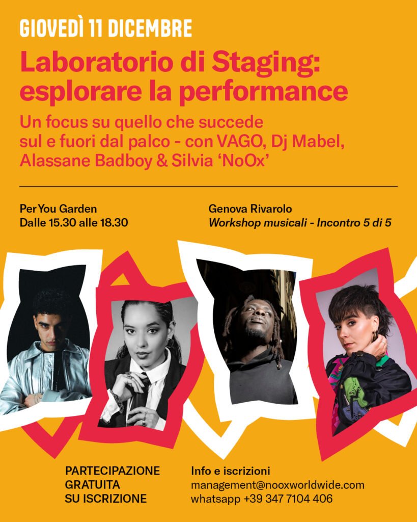 - Laboratorio di Staging (11 dicembre 2025, Per You Garden): un focus su quello che accade sul e fuori dal palco, dalla performance alla preparazione dietro le quinte, con VAGO, Dj Mabel, Alassane Badboy & Silvia ‘NoOx’.